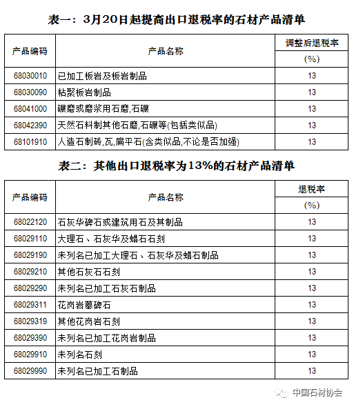從石材行業來看,加上原有10個稅則號出口退稅率為13%的石材產品(表二),已有15個稅則號的石材產品出口退稅率提高13%。15個稅則號的石材產品2019年的出口量和出口額分別占到石材出口總量的76%和出口總值的88%。