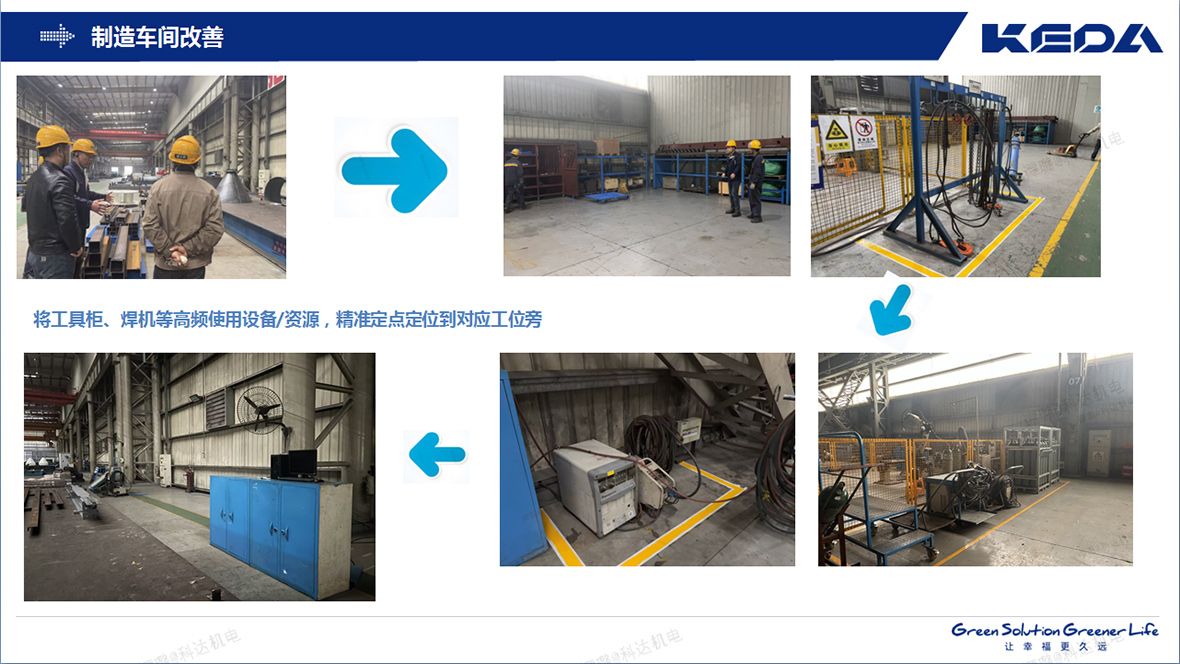 安徽科達(dá)機(jī)電深度聚焦作業(yè)效率,系統(tǒng)性地將工具柜、焊機(jī)等高頻使用設(shè)備/資源,精準(zhǔn)定點(diǎn)定位到對(duì)應(yīng)工位旁。大幅減少了設(shè)備拖曳、接駁的時(shí)間浪費(fèi)和安全隱患;總裝車間則利用呆滯物料改制智能電控樁,實(shí)現(xiàn)集成化作業(yè),提高了裝配效率的同時(shí)又改善了現(xiàn)場(chǎng)環(huán)境。這一系列定點(diǎn)布局優(yōu)化,顯著縮短了操作人員的非增值走動(dòng)和準(zhǔn)備時(shí)間,讓員工能將更多精力集中于核心價(jià)值創(chuàng)造,生產(chǎn)效率得到切實(shí)提升!