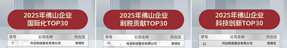 科達制造第七度入圍“佛山企業100強”榜單,排名大幅躍升,從2024年的第39位躍至第28位。同時,科達制造還上榜“制造業企業100強”、“民營企業100強”、“國際化TOP30”、“利稅貢獻TOP30”、“科技創新TOP30”的全部榜單。其中,在“民營企業100強”中排名第21位,“制造業企業100強”中位列第13位,排名均顯著提升,“國際化TOP30”“利稅貢獻TOP30”“科技創新TOP30”分別位列第7、13、22名。