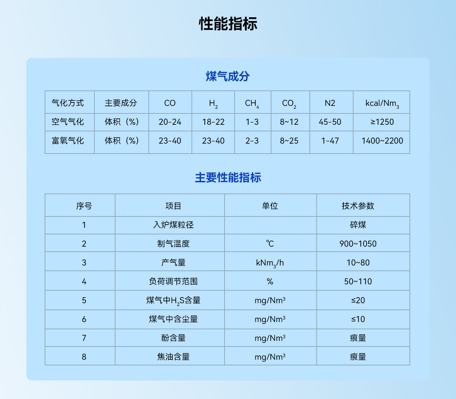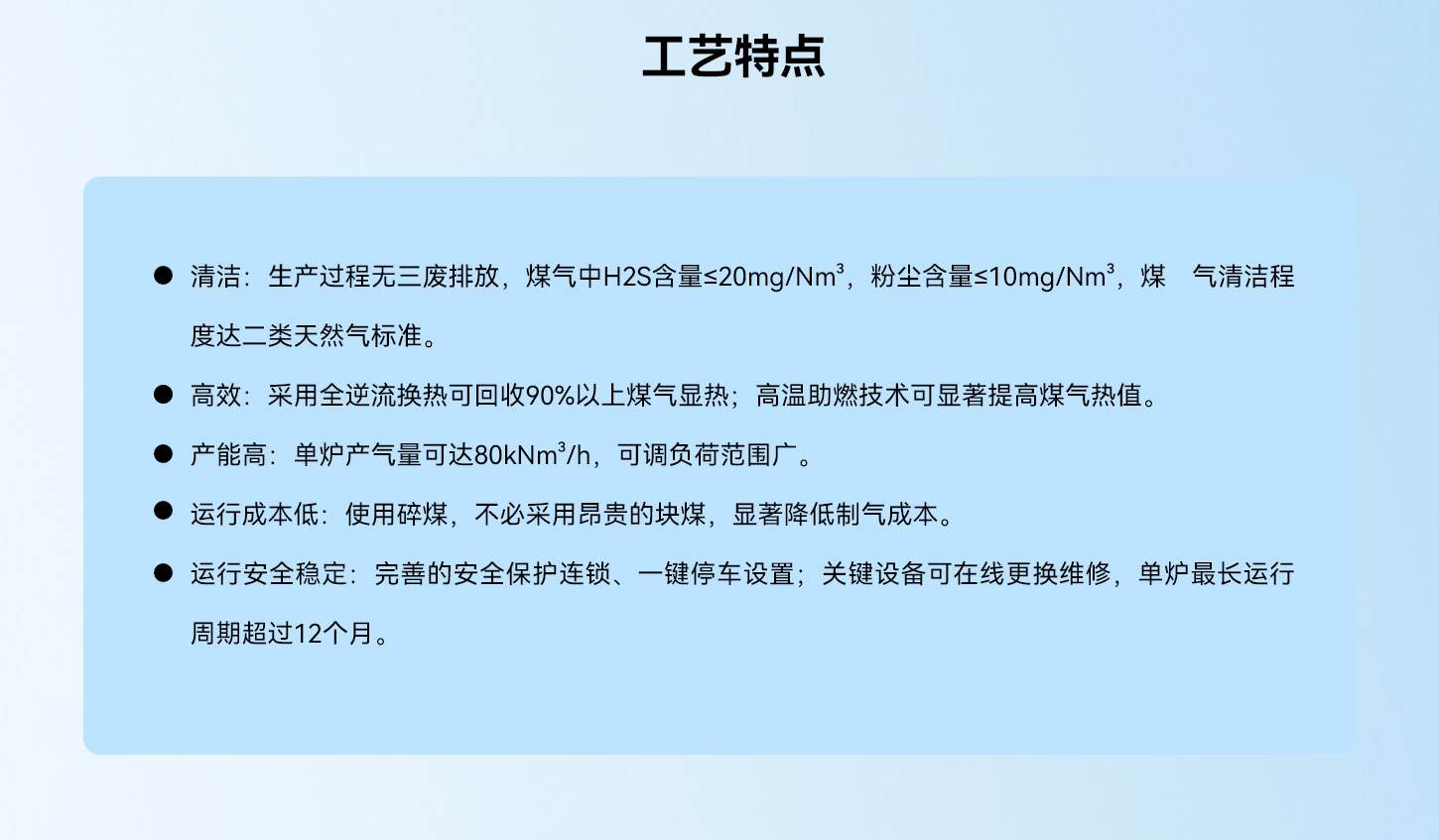 ● 清潔:生產(chǎn)過程無三廢排放,煤氣中H2S含量≤20mg/Nm3,粉塵含量≤10mg/Nm3,煤 氣清潔程度達二類天然氣標準。