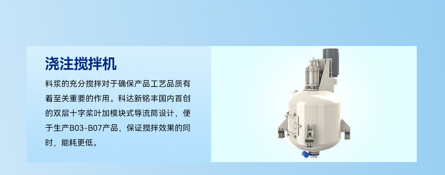 料漿的充分?jǐn)嚢鑼τ诖_保產(chǎn)品工藝品質(zhì)有著至關(guān)重要的作用。科達(dá)新銘豐國內(nèi)首創(chuàng)的雙層十字槳葉加模塊式導(dǎo)流筒設(shè)計,便于生產(chǎn)B03-B07產(chǎn)品,保證攪拌效果的同時,能耗更低。