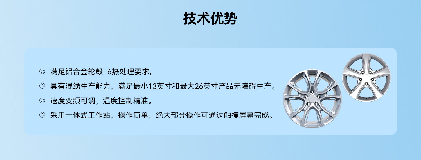 ◎ 滿足鋁合金輪轂 T6 熱處理要求。 ◎ 具有混線生產(chǎn)能力,滿足最小 13 英寸和最大 26 英寸產(chǎn)品無障礙生產(chǎn)。 ◎ 速度變頻可調(diào),溫度控制精準(zhǔn)。 ◎ 采用一體式工作站,操作簡單,絕大部分操作可通過觸摸屏幕完成。