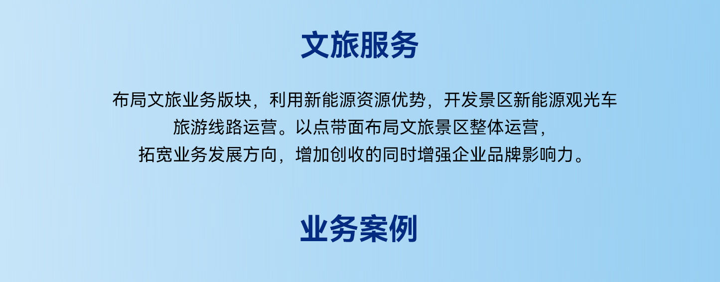 布局文旅業務版塊,利用新能源資源優勢,開發景區新能源觀光車旅游線路運營。以點帶面布局文旅景區整體運營,拓寬業務發展方向,增加創收的同時增強企業品牌影響力。